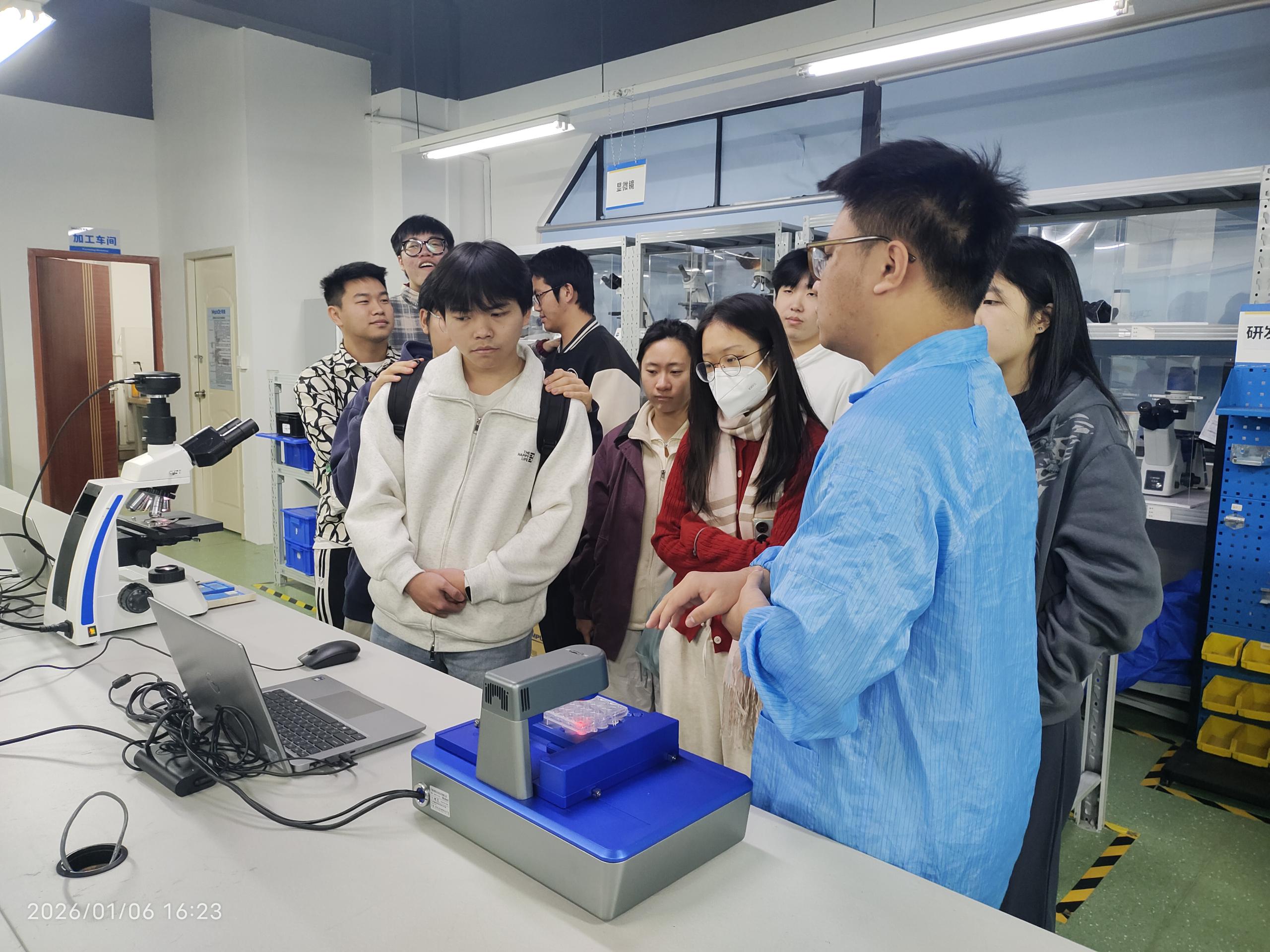 理論環節結束后,同學們分組進入公司核心區域進行實地參觀。本次參觀路線涵蓋研發小試區、工程中試區、生產組裝區和產品檢驗區,生產部經理周安教、技術部工程師李驍凡等參與了接待講解,為同學們介紹了公司活細胞掃描分析儀MCS31、生物顯微鏡ML45等重點產品。