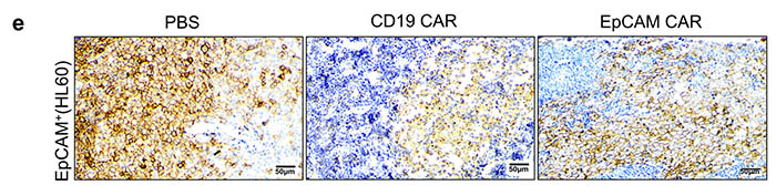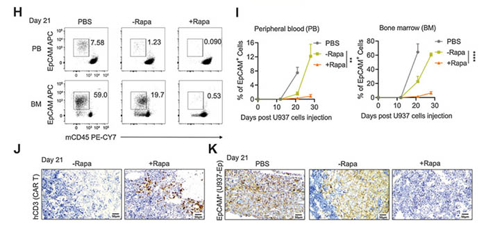 研究人員使用明美倒置熒光顯微鏡MF50和明美成像分析軟件構建了顯微成像分析系統,通過免疫組織化學 (IHC) 染色觀察靶向EpCAM的CAR-T在不同情況下對AML細胞的清除效果,發現雷帕霉素預處理能有效提升治療效果。
