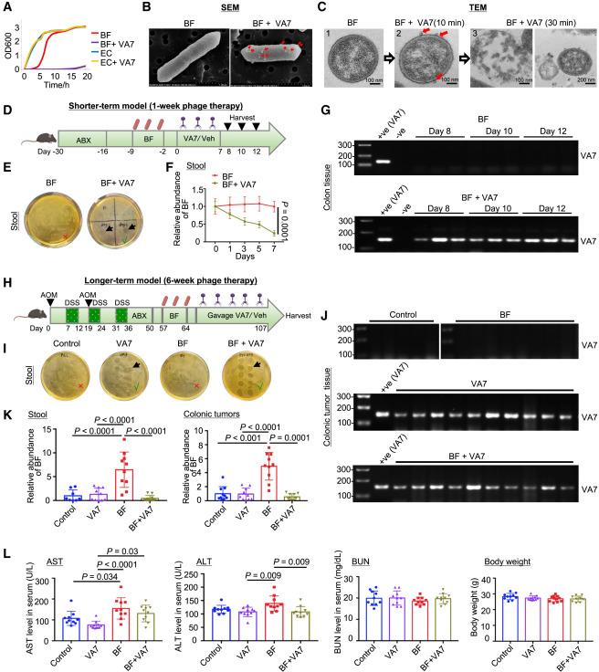 通過體外噬菌體殺傷實驗、構建短期和長期噬菌體治療模型,得出VA7可以特異性破壞BF,對EC無顯著殺傷作用,噬菌體VA7降低了BF在糞便以及腫瘤組織中的豐度,且對肝功能、腎功能和體重等無顯著影響。