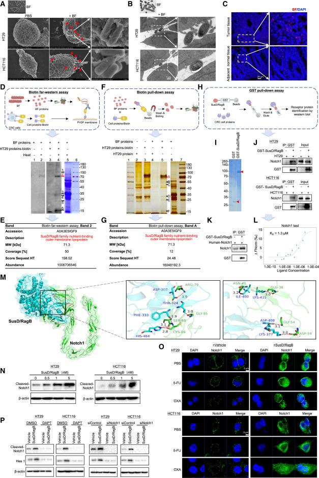 GST pull-down 實驗證實,純化的 GST-SusD/RagB 融合蛋白可特異性地從 HT29 和 HCT116 細胞裂解液中拉下 Notch1 蛋白;通過不同濃度SusD/RagB 處理后 Cleaved-Notch1(NICD1)及下游靶基因(Hes1)的表達和定位,驗證BF 通過其外膜蛋白 SusD/RagB 直接結合并激活 Notch1 信號通路,從而促進結直腸癌化療耐藥(圖4N-O)。
