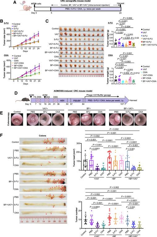 最后,研究人員探究了VA7在體內克服BF的化療耐藥作用。構建HT29 異種移植瘤模型和AOM/DSS 誘導的 CRC 模型,分別給予 PBS、BF、BF+VA7 處理,同時聯用 5-FU 或 OXA 化療,BF+VA7分別抑制了BF介導的化療中結直腸腫瘤的生長和腸道病變。結論:噬菌體VA7 靶向清除 BF 可有效逆轉化療耐藥,并恢復腫瘤對化療的敏感性。