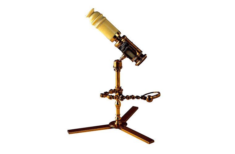上圖這款古董級顯微鏡 Universalmikroskop Nack Wiloson (Nack Wiloson 萬能顯微鏡;Universalmikroskop為德語)大約生產于1725年;制造商是當時的Edmund Culpeper London公司。該顯微鏡現珍藏于德國耶拿光學博物館。- {明美-走進顯微鏡歷史博物館系列}